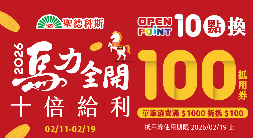 活動期間於「聖德科斯門市」或「OPENPOINT APP」使用OPENPOINT點數10點可兌換「100元滿額抵用券(滿千抵用)」(價值100元)。